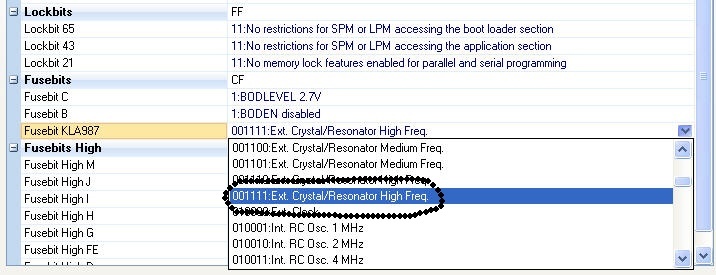 Je-li ATmega správně připojená, zobrazí se v okně výpis programovatelných pojistek ATmegy8. V záložce vybereme Fusebit KLA987, rozklikneme a vybereme 001111.